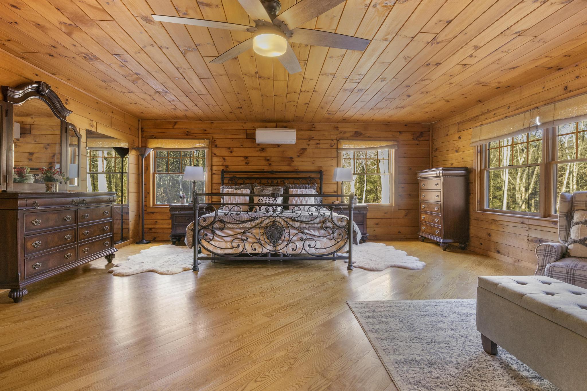 Indulge in spacious comfort in the expansive Master Suite. Beneath warm wood ceilings and diagonal hardwood floors, this retreat features a striking wrought-iron King bed and a cozy sitting area perfect for morning coffee. Modern comforts like a mini-split AC ensure the perfect temperature year-round while you enjoy the woodland views.