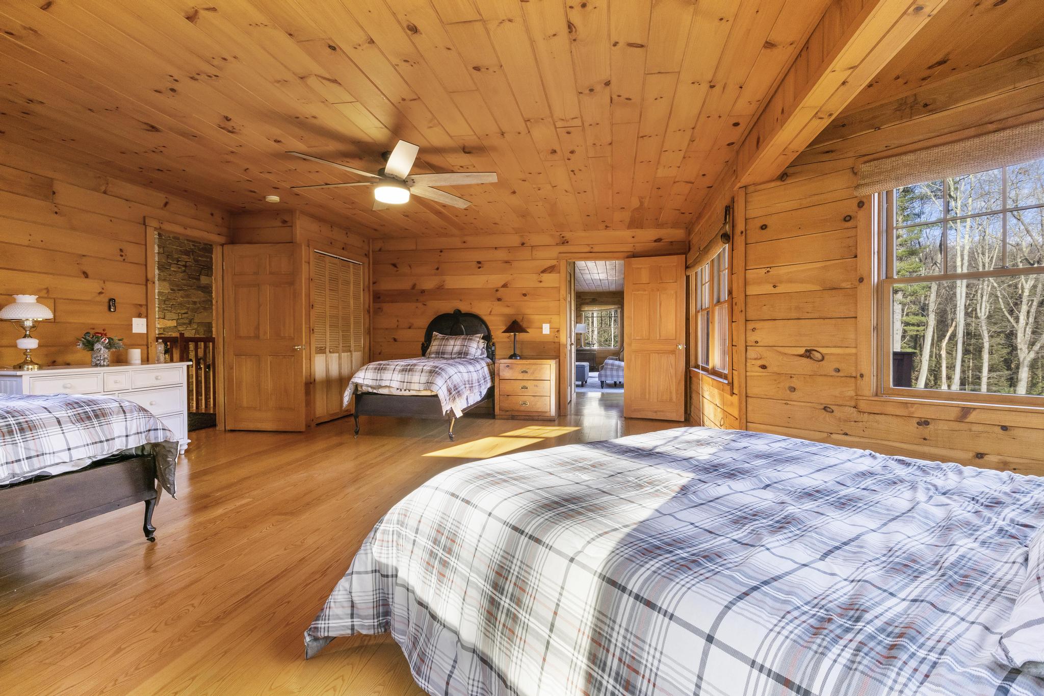 Bright, airy, and unmistakably rustic, this spacious guest room captures the essence of cabin living. Wrapped in golden knotty pine with high ceilings and large windows, the room invites the outdoors in. With ample floor space and classic furnishings, it offers a peaceful and flexible setting for relaxation.