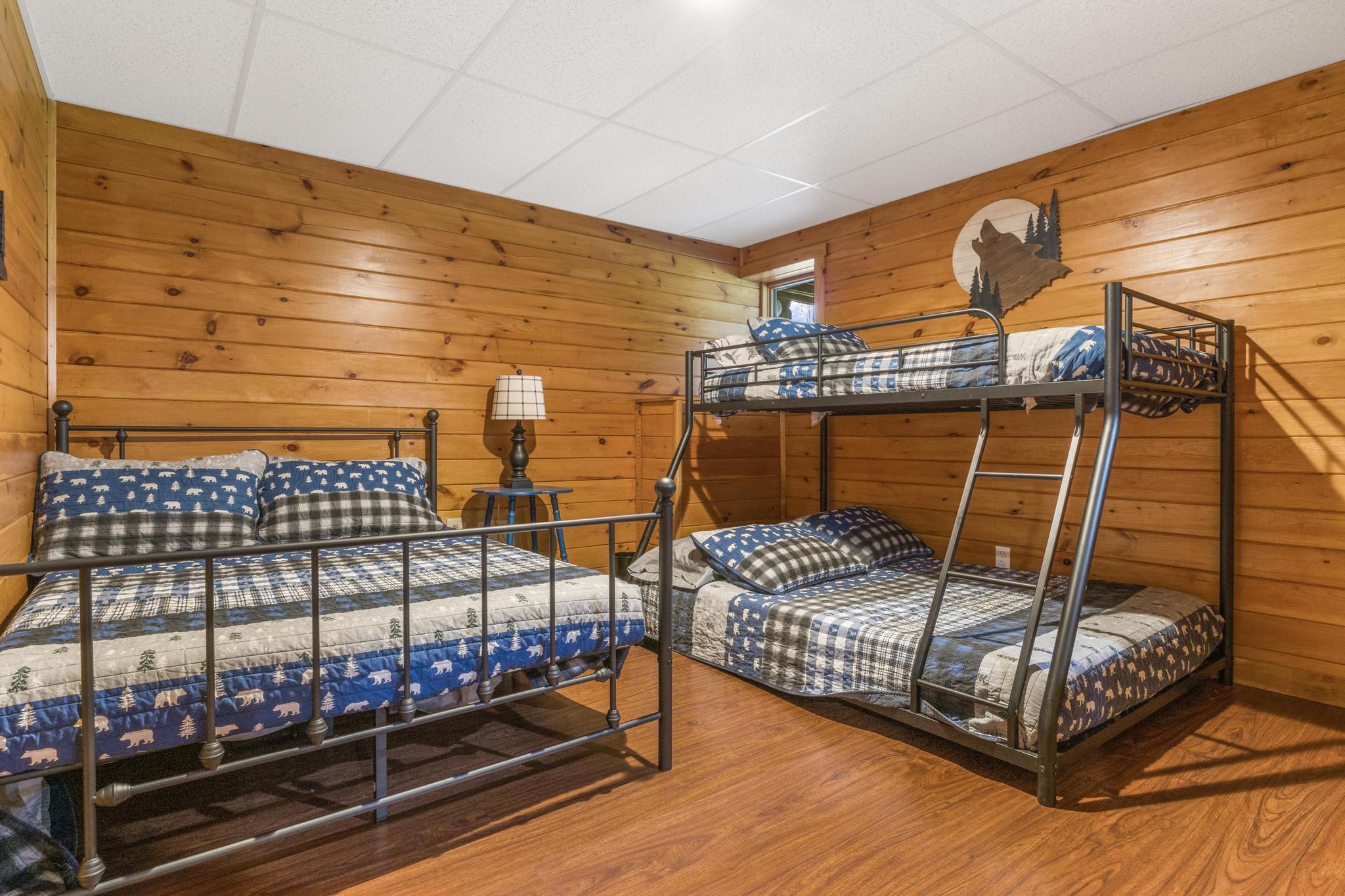 Perfect for the kids or a group of friends, this lower-level bunk room is designed for fun and function. Themed with charming wilderness decor and plaid bedding, it maximizes sleeping space with a bunk layout and an additional bed, making it the ultimate cozy hideaway after a day of exploring.